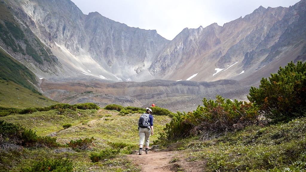 Чтобы осмотреть Вилючинский вулкан со стороны, для начала мы поднимемся на автомобиле на одноименный перевал. С его километровой высоты открывается панорама горной долины с семью соседними вершинами и, конечно, лучший вид на сам Вилючинский вулкан, изрезанный глубокими оврагами. На смотровой площадке есть скамейки с видом на сопку, информационные стенды о природе Камчатки и тотемные столбы с изображением духов из местных легенд.