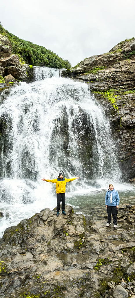 Дальше мы будем подниматься все выше в горы и пройдем по пути несколько водопадов. Они не такие высокие, как Вилючинский, и относятся к другому типу. Река здесь спускается по скалам каскадами, иногда — звенящими ручейками, иногда — бурным пенным потоком.
