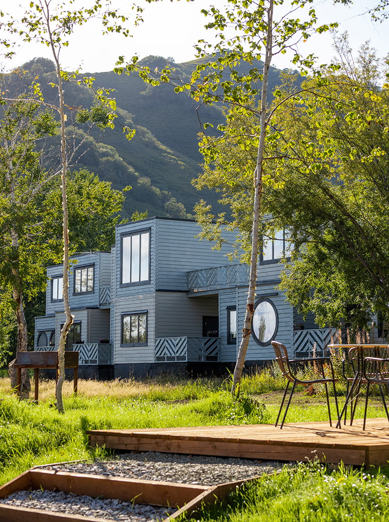 Размещение двухместное в модульном домике Стандарт, площадью 21 м. В каждом есть душ, туалетная комната и обеденная зона. На территории базы есть открытый бассейн с горячей водой, хороший ресторан, детская зона, спа-зона.