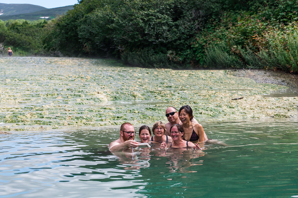 Завершаем экскурсию купанием в горячей речке, которая питается термальными источниками и сохраняет комфортную температуру даже зимой.