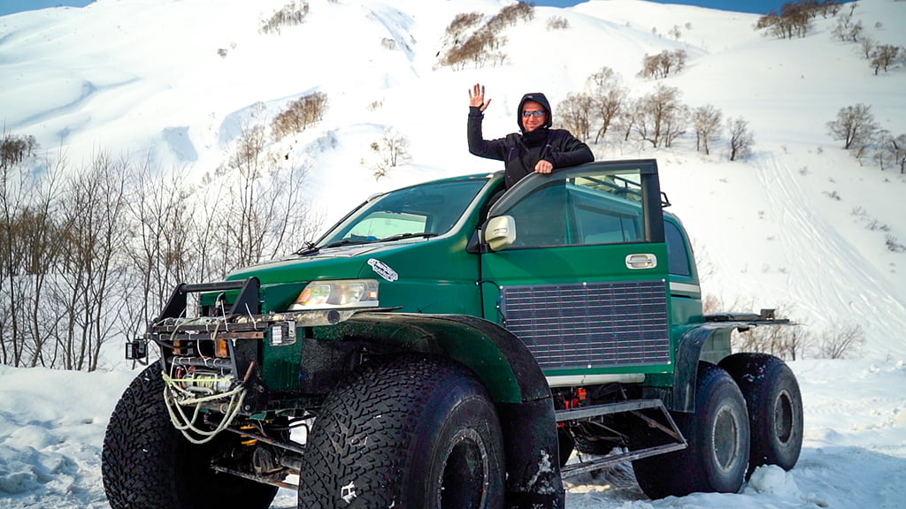 Первая остановка - Вилючинский перевал. Пока едем, вы можете наблюдать местные вулканы и первую растительность, которая весной начинает просыпаться. Дорога идет через долины и леса – кое-где еще лежат сугробы, а на склонах уже показались проталины.