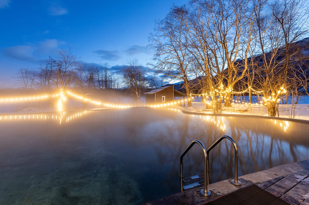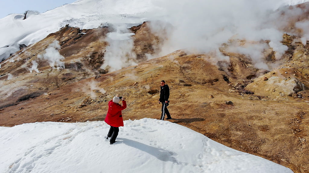 Дальше едем к Дачным источникам - природному комплексу с горячими термальными водами. По приезду гид объясняет правила поведения и рассказывает, чем полезны минеральные воды. Вокруг снег, из кипящей воды поднимается пар, атмосфера очень уютная. Кто хочет, гуляет по окрестностям, смотрит на фумаролы и небольшие грязевые котлы.