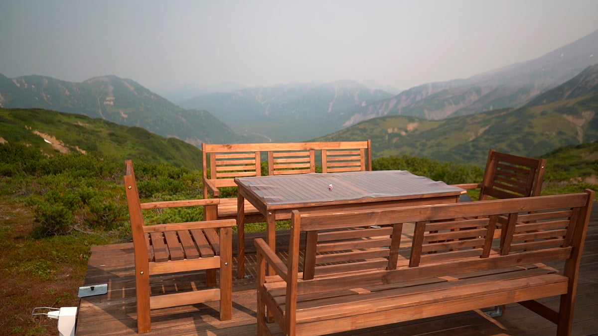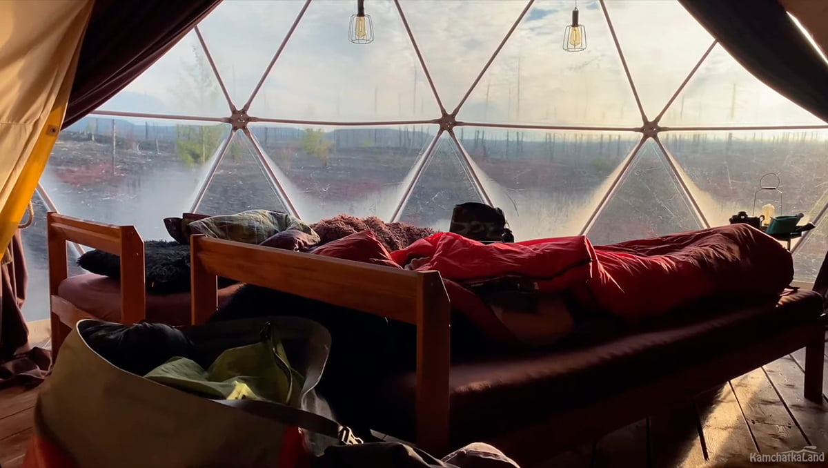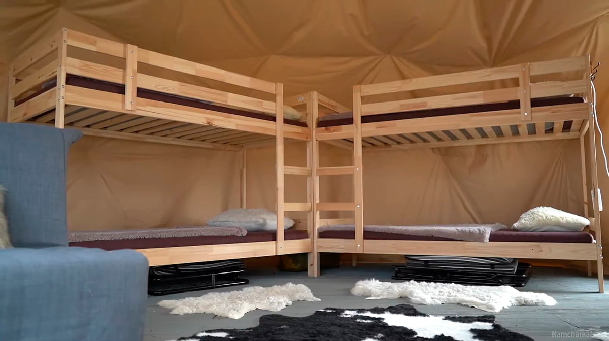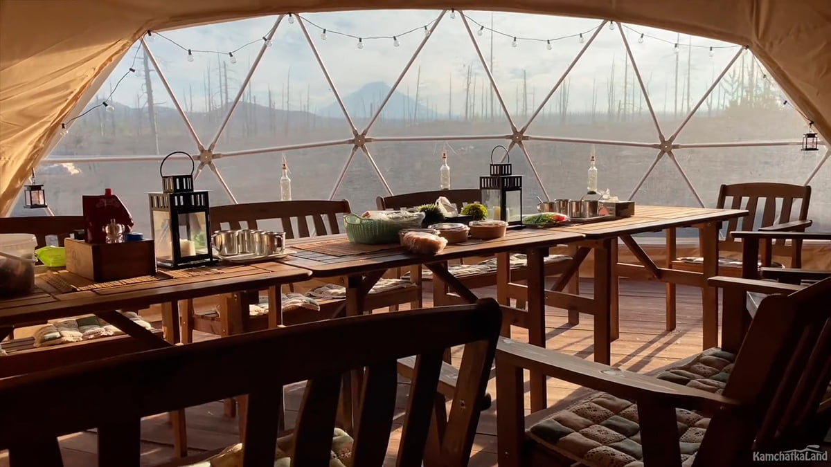 Заселяемся в глэмпинг. Наш лагерь на предстоящие два дня — это группа комфортных шатров с кроватями, уютным интерьером и большой столовой. Расположенный в уникальном месте на Вилючинском перевале, он служит лучшей отправной точкой для экскурсий по окрестностям.