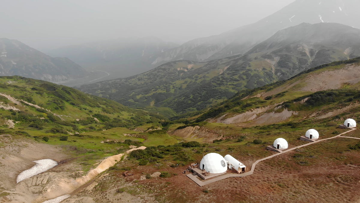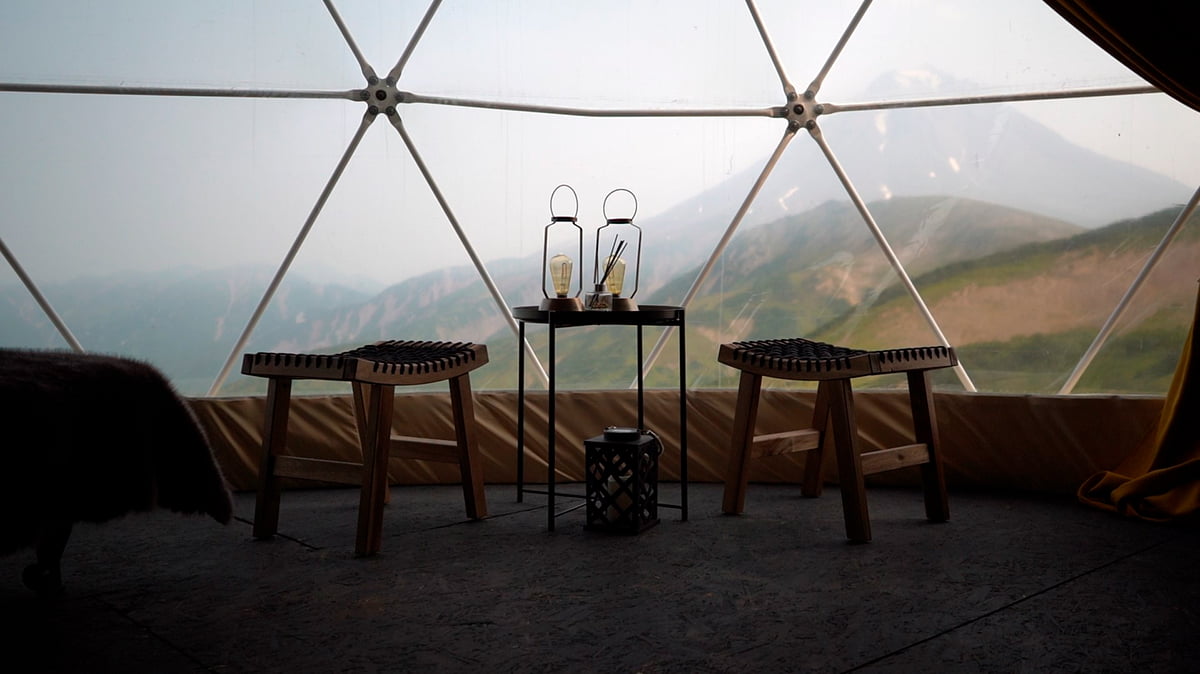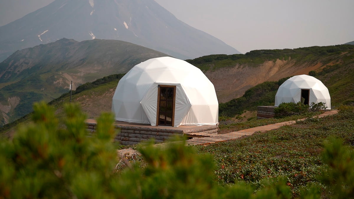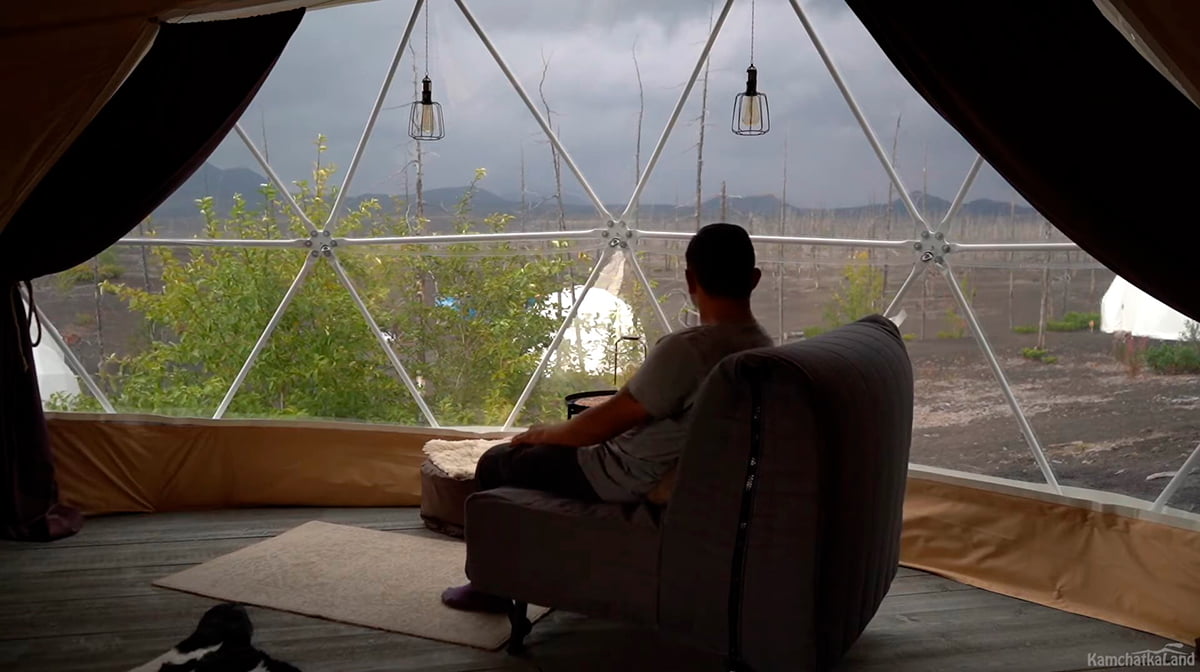 При посещении Южной группы вулканов мы остановимся не в палатках, а в уютном глэмпинге с видом на Вилючинский вулкан. Сам глэмпинг находится на самом верху Вилючинского перевала и с его территории открывается потрясающий обзор всей долины.