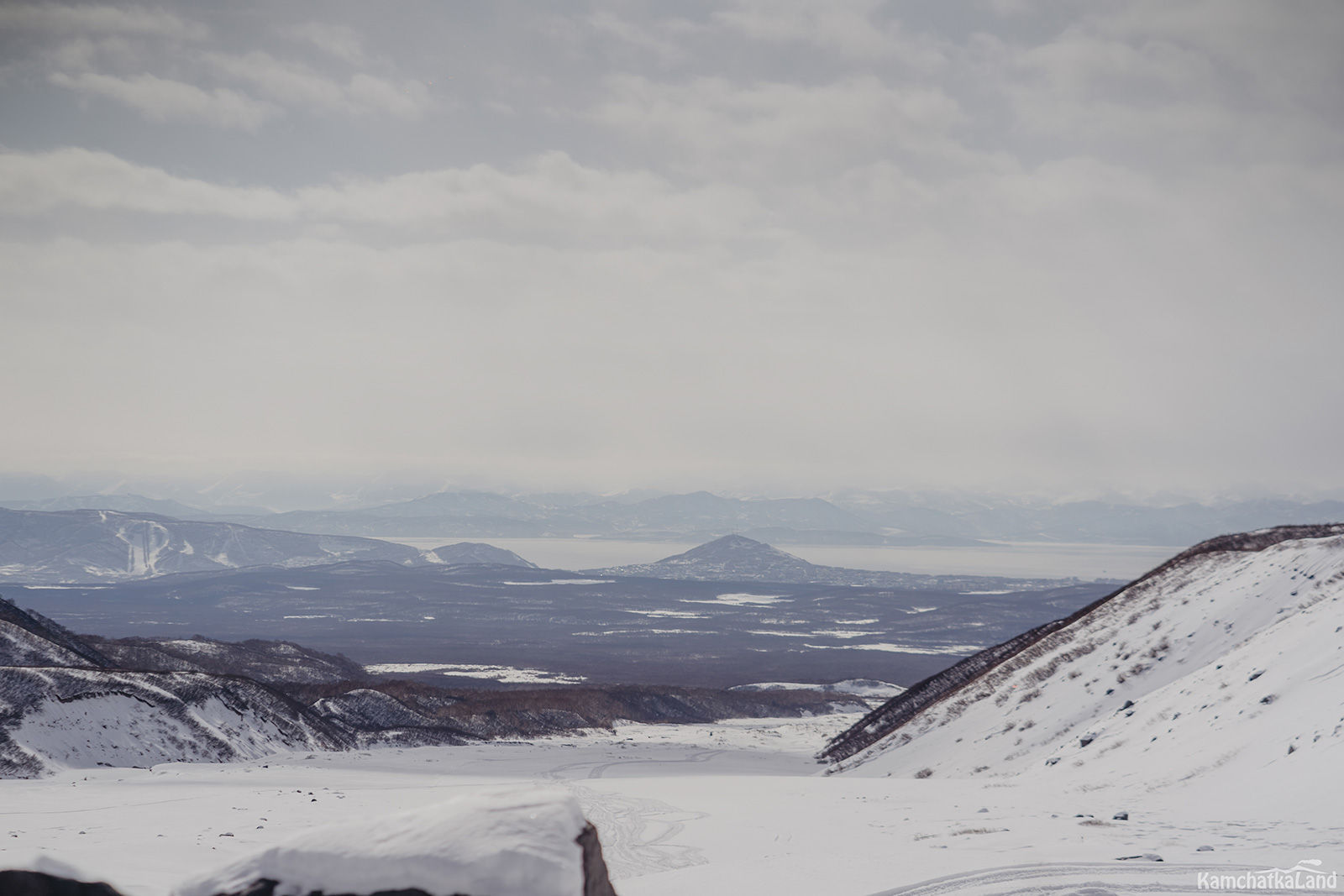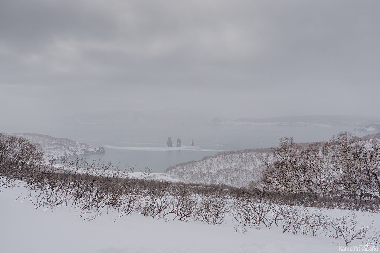 Зима приносит на Камчатку огромное количество снега. На берегу сугробы вырастают выше человеческого роста, а в горах снег ложится слоями по несколько метров. Склоны и долины выглядят так, будто их накрыли плотным белым покрывалом и спрятали под ним деревья, строения и камни.